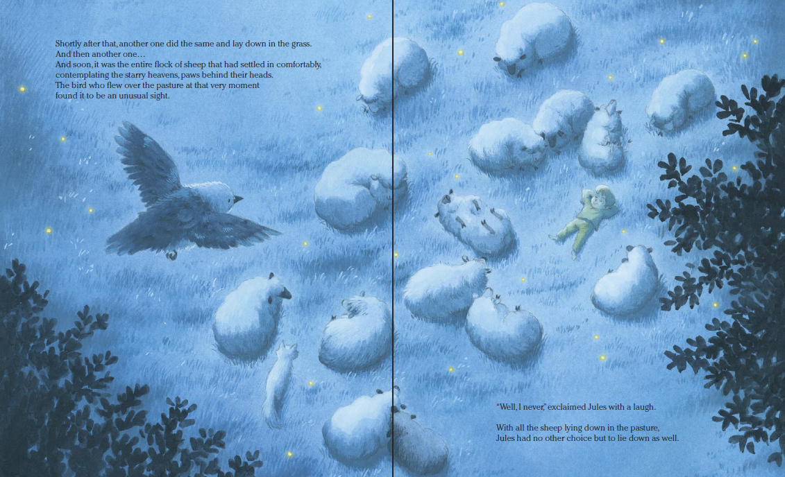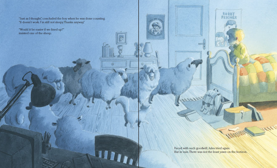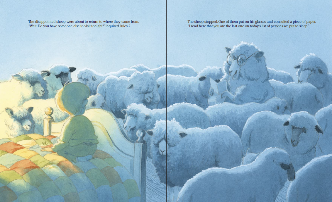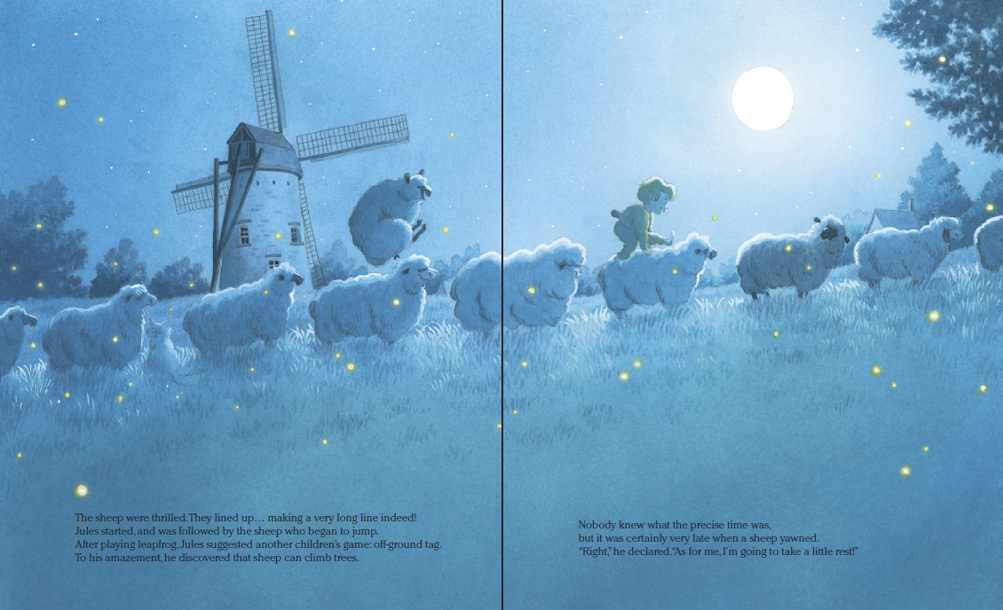 줄스가 잠을 이루지 못하자, 어느 새 창문으로 양이 한 마리, 두 마리, 세마리… 찾아와 줄스에게 양을 세어보라고 말해요. 어느 새 양이 방에 가득 차고, 줄스가 양들을 세어보지만 소용이 없어요. 그래서 양들은 원래 있던 곳으로 돌아가는 대신, 줄스와 함께 카드놀이, 밤 산책, 술래잡기 등을 하며 즐거운 시간을 보내요. 결국 누가 가장 먼저 잠이 들게 될까요?