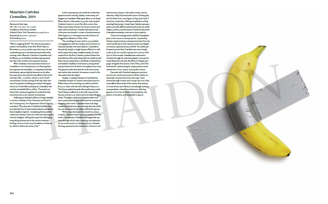 1997년 소더비에 출품된 티라노사우루스 화석인 ‘수’에서부터, 절반파쇄로 새롭게 탄생한 뱅크시의 <Girl Without Balloon>, 그리고 화제의 카텔란의 바나나 설치 작품, 또한 레오나르도 다 빈치, 피카소, 세잔, 프리다 칼로, 모네, 잭슨 폴록, 조지아 오키프 등 우리가 알고 있는 위대한 예술가들의 작품들이 어떻게 ‘예술’에서 ‘아이콘(icon)’으로 자리 잡게 되었는지를 보여준다.