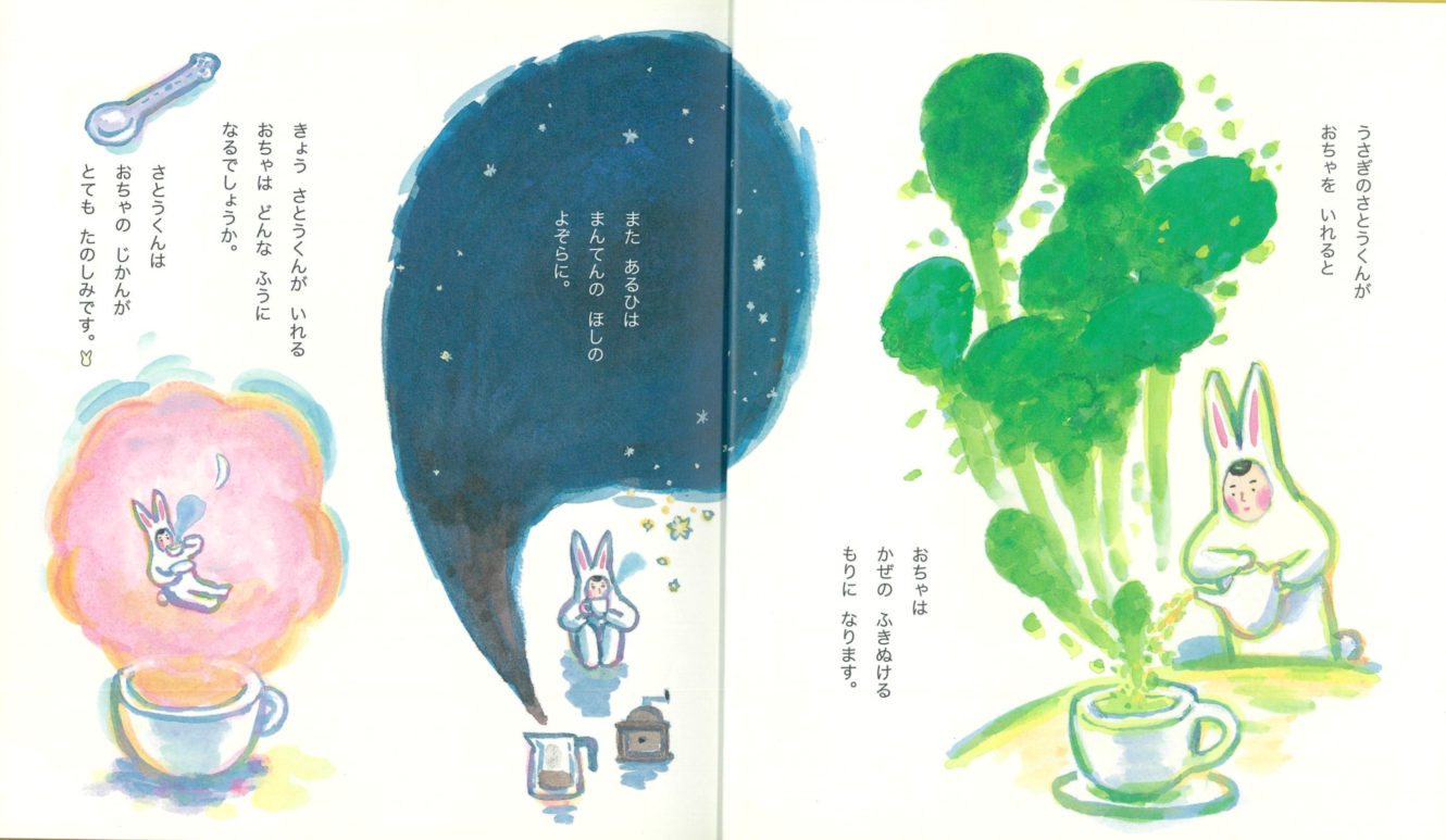 사토군이 차를 끓이면,찻잎은 작은 배가 되고, 홍차는 넓은 바다로 변합니다.사토군은 그 배를 타고, 찻물의 바다를 향해 노를 젓지요.