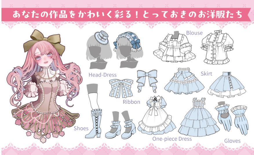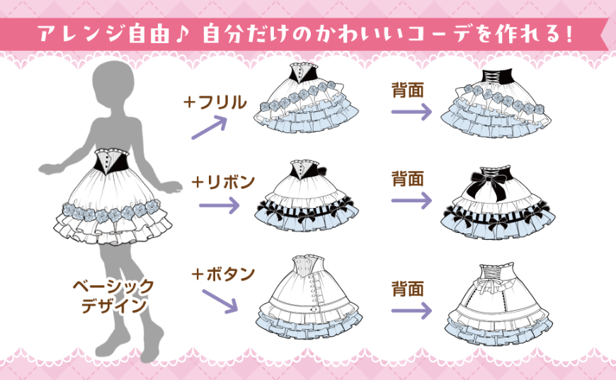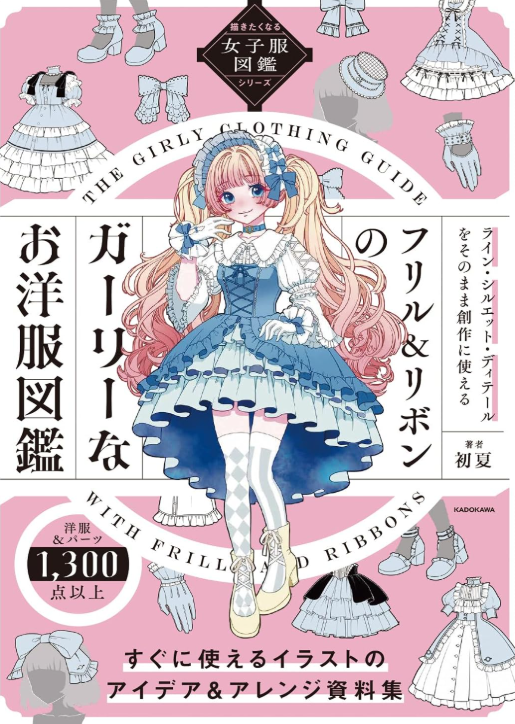 리본, 프릴, 레이스, 버튼, 볼륨감 있는 스커트 등, 페미닌하고 로맨틱한 세계관을 가진 디자인을 풍부하게 수록했습니다. 세부까지 계산된 디자인은 보는 이의 ‘귀여움’을 자극하며, 일러스트나 패션 디자인 제작의 훌륭한 힌트가 됩니다.