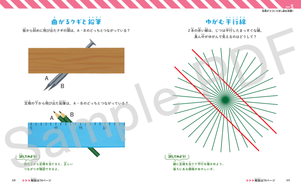책을 멀리서 보거나, 거꾸로 보거나, 자로 길이를 재어 보는 등 다양한 방법으로 착시 그림을 즐길 수 있습니다. 분명 놀랄 만한 경험이 많을 거예요.