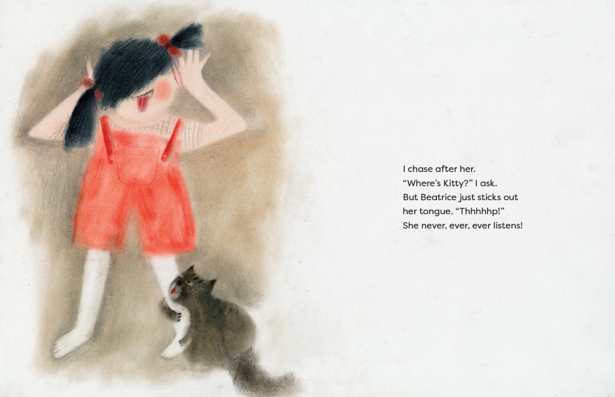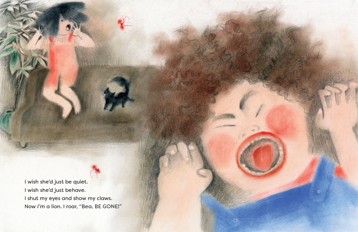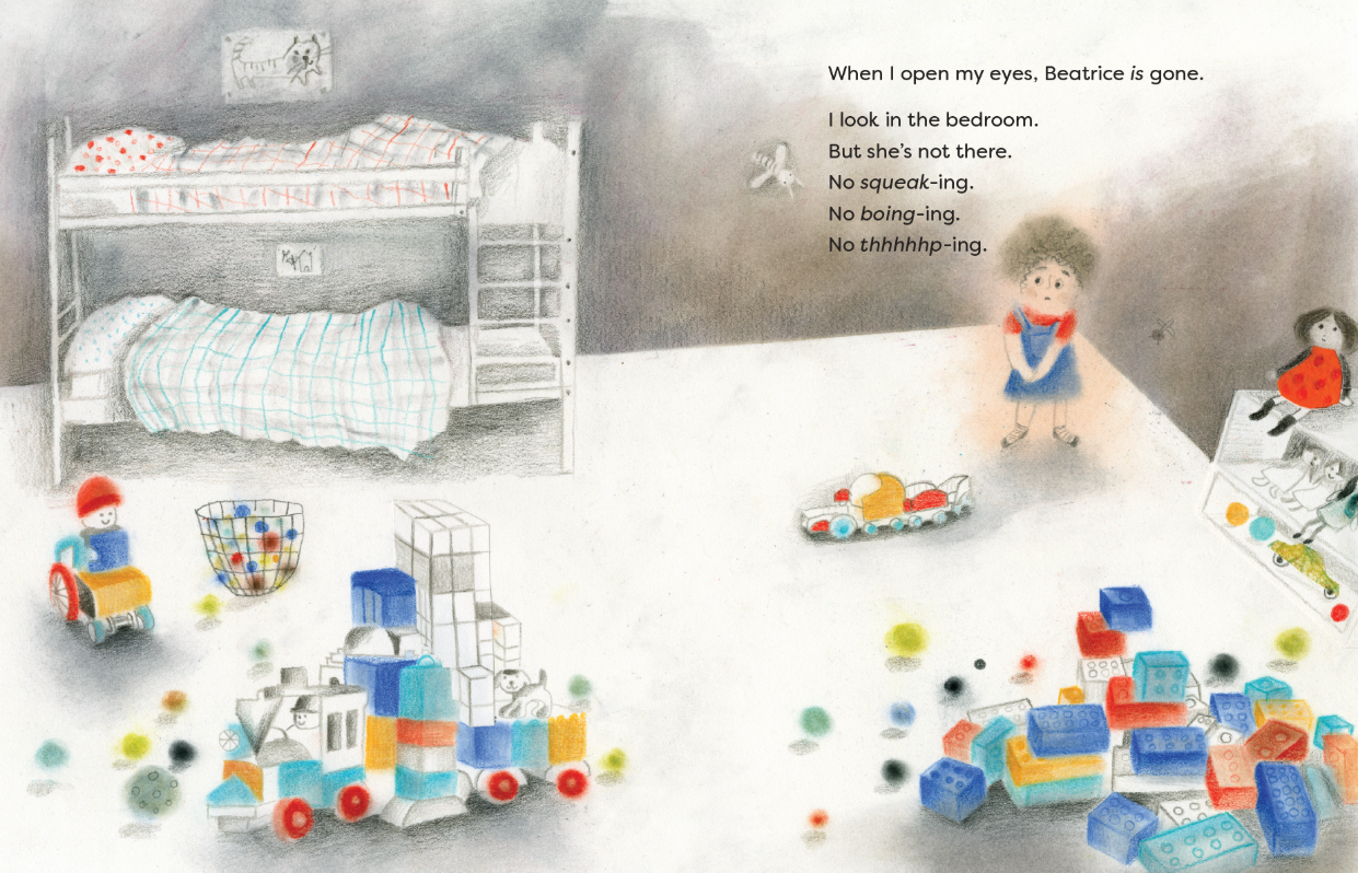 이 유쾌한 그림책에서, 현실적이고 내성적인 화자는 자신과는 다른 성향의 말썽꾸러기 여동생의 장난 때문에 힘들어 해요. 동생 베아는 절대, 절대로 말을 듣지 않고 자기만의 리듬에 맞춰 살아가요. 화자인 언니는 화가 나 베아가 사라져 버리길 바래요. 그런데 그 소원이 뜻밖에도 이루어 지자, 생각하던 삶과는 너무 달라 놀라게 돼요. 갑자기 집은 너무 조용해지고, 놀이는 재미없어지며, 중요한 무언가를 잃어버린 느낌이에요...