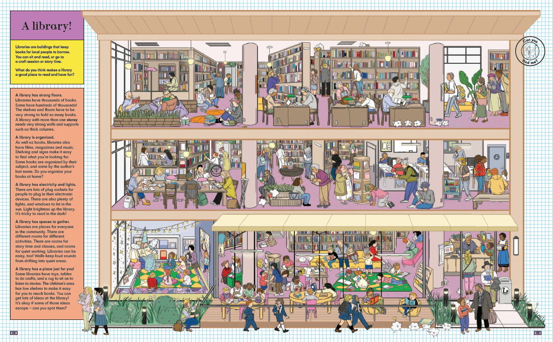 🔍 건물 속을 들여다보는 단면도와 쉽고 흥미로운 건축 개념 각 건물의 구조를 잘라 보여주는 정교한 단면도가 펼쳐져요. 아이들은 건물 안 사람들의 움직임, 공간의 기능, 숨은 요소들을 관찰하며 자연스럽게 건축 원리를 배우게 됩니다.
