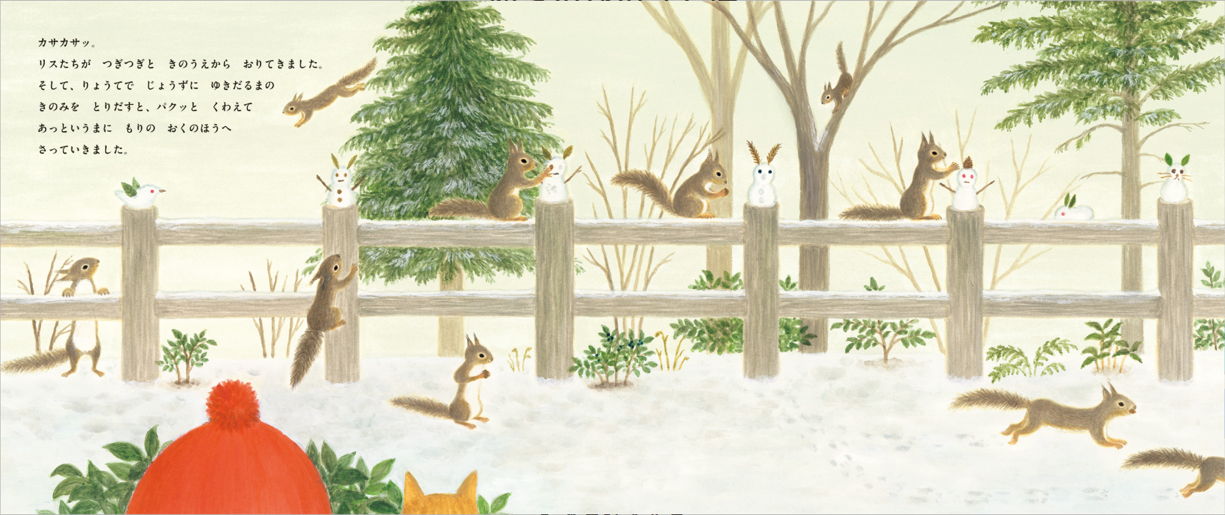두 친구는 힘을 모아 귀여운 눈사람을 만들고, 눈사람에게 환한 미소를 선물하기 위해 주변에서 주운 반짝이는 작은 나무 열매들로 눈과 입을 만들어 줍니다.