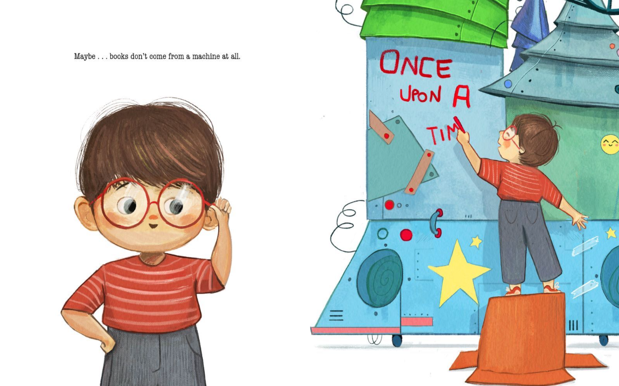 창의력과 상상력, 그리고 글쓰기 과정을 다룬 이 그림책은 책을 너무 좋아해서 책이 더 많이 필요한 한 소년의 기발한 아이디어를 통해 기계는 결코 작가를 대신할 수 없다는 사실을 유쾌하게 보여줘요.