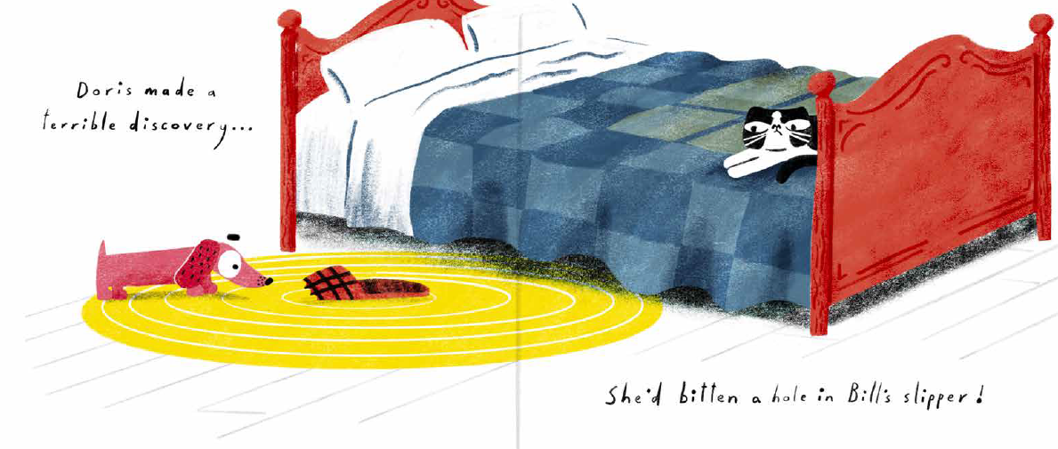 하지만 어느 날 아침, 도리스의 ‘완벽한 세계’에 균열이 생겼습니다. 빌의 슬리퍼에 동그란 구멍 하나가 뽕! 그 순간 도리스의 머릿속은 “빌이 화나면 어떡하지? 슬프면 어떡하지? 둘 다면?!”로 아수라장이 됩니다. 결국 선택한 건… 도망쳐 그리고 슬리퍼를 숨겨!