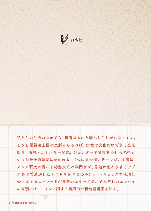본 책은 아시아 연구에 종사하는 총 20명의 전문가가 급변하는 아시아 각지에서 겪은 화장실을 둘러싼 문화 충격(컬처 쇼크)이나 현지 사회에 관한 에피소드가 가득 담긴 에세이집입니다.