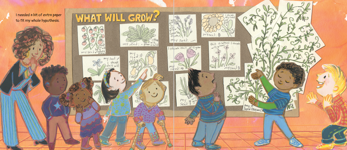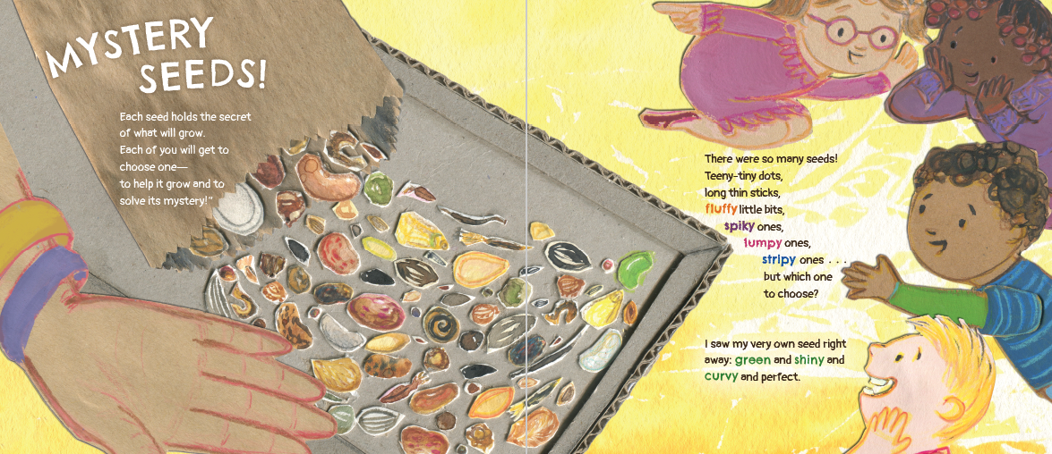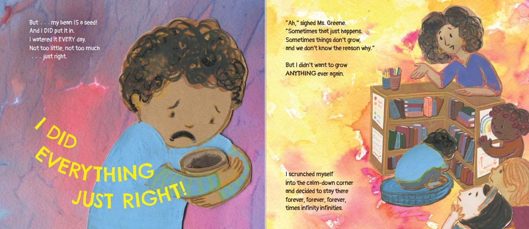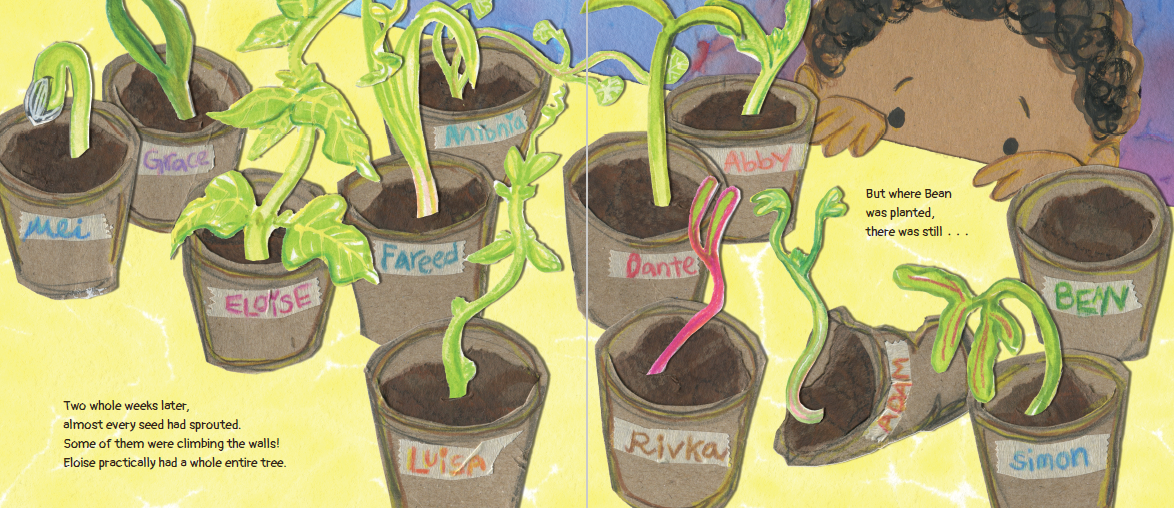 어린이는 실망을 극복하고 다시 시도하는 법을 배운다. 벤의 반은 미스터리 씨앗을 심고 있다. 각 학생은 다양한 씨앗이 든 가방에서 하나를 골라 관찰을 통해 무엇이 자랄지 가설을 세운 뒤, 자신의 예측을 시험해 보려고 씨앗을 심는다. 벤은 씨앗 하나를 골라 '빈'이라고 이름 붙인다. 씨앗에 매료된 벤은 빈이 마법처럼 엄청나게 커질지도 모른다고 추측한다. 하지만 벤이 모든 것을 제대로 했음에도 빈은 전혀 자라지 않는다. 다른 학생들의 식물이 싹을 틔우자 벤은 질투, 비난, 슬픔 같은 감정을 겪는다. 담임인 그린 선생님은 벤을 위로한다. “가끔은 자라지 않는 일도 있고, 그 이유를 알 수 없을 때도 있어요.” 다시는 아무것도 키우지 않겠다고 결심한 벤은 남은 미스터리 씨앗 봉지를 발견하고 마음을 바꿉니다. 버려지는 것을 막기 위해 벤은 과학적 방법과 친구들의 도움을 받아 빈을 기리는 새로운 정원을 가꾸기로 합니다. 삽화에는 추상적인 수채화 배경에 오려 붙인 캐릭터들이 등장하며, 색채가 분위기를 반영해 변화한다. 서사 구조와 STEM 개념이 효과적으로 통합되어 과학적 사고와 문제 해결이 이야기를 이끌어간다. 부록에는 씨앗이 자라는 과정에 대한 추가 정보가 수록되어 있다. 벤과 그린 선생님은 갈색 피부이며, 반은 다양한 인종으로 구성된다. 이 다층적인 이야기는 자연, 과학적 방법, 정서적 회복탄력성에 대한 배움의 씨앗을 심어준다.
