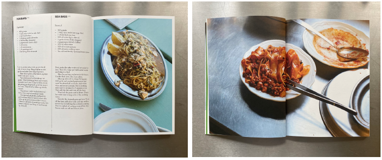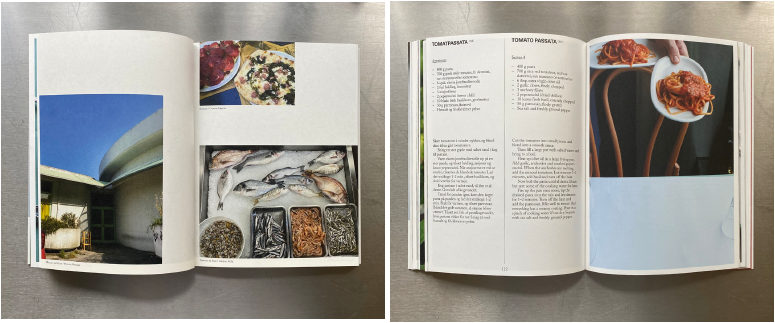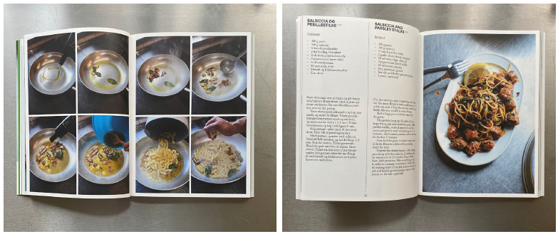 덴마크어와 영어로 병기되어 있으며, 각 요리의 완성 사진과 이탈리아 여행에서 얻은 영감, 추천 레스토랑 정보까지 함께 담고 있다.