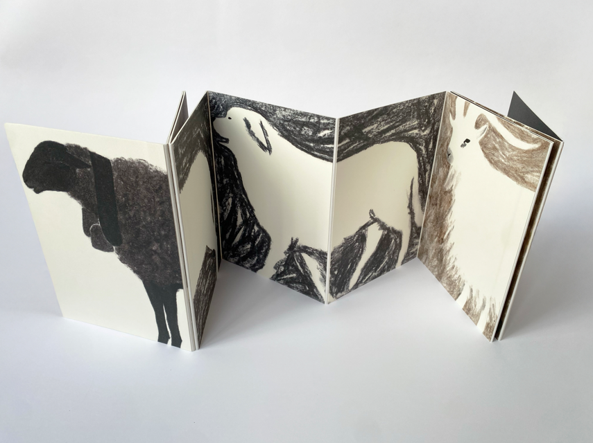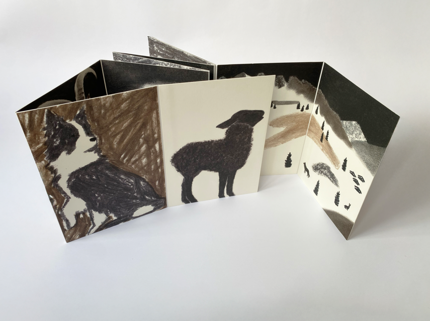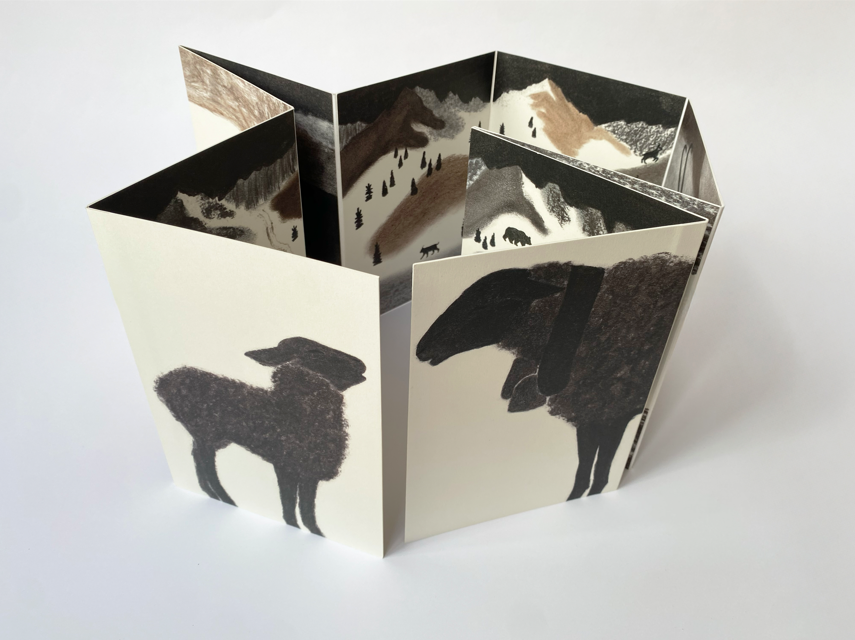 이 책은 여름 산의 풍경과 동물들을 담은 아코디언 형식의 그림책입니다. 책의 앞면에서는 여름 목초지를 즐기는 양 떼를 중심으로 염소, 독수리, 늑대, 마멋 등 산의 동물들을 관찰할 수 있고, 뒷면에서는 하늘에서 내려다본 듯한 장대한 산의 풍경—평원, 호수, 능선, 마을—이 펼쳐집니다.