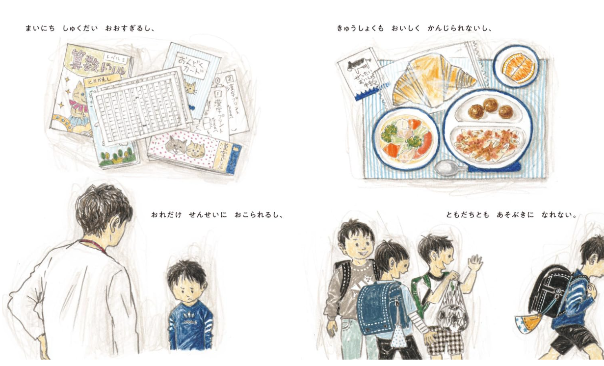 숙제와 학교생활에 지친 한 소년이 집 고양이를 보며 푸념합니다.