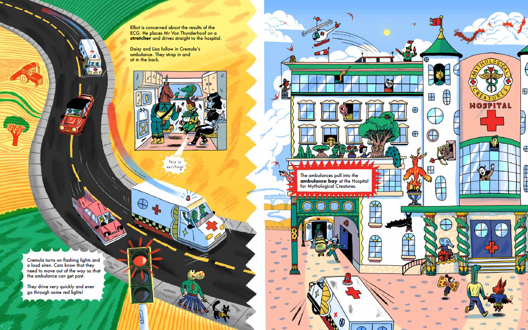 어느 날 아침, 응급 센터의 다니는 긴급한 전화를 받습니다. "사고가 발생했어요!" 팔이 부러진 데이지, 머리를 다친 리사, 그리고 가슴 통증을 호소하는 폰 썬더후프 씨까지. 구급차에 실려 이들이 도착한 곳은 바로 '환상 동물들을 위한 병원'입니다. 이곳에서는 간호사, 의사, 방사선사, 환자 이송 요원들이 환자들을 돕기 위해 일사분란하게 움직입니다.