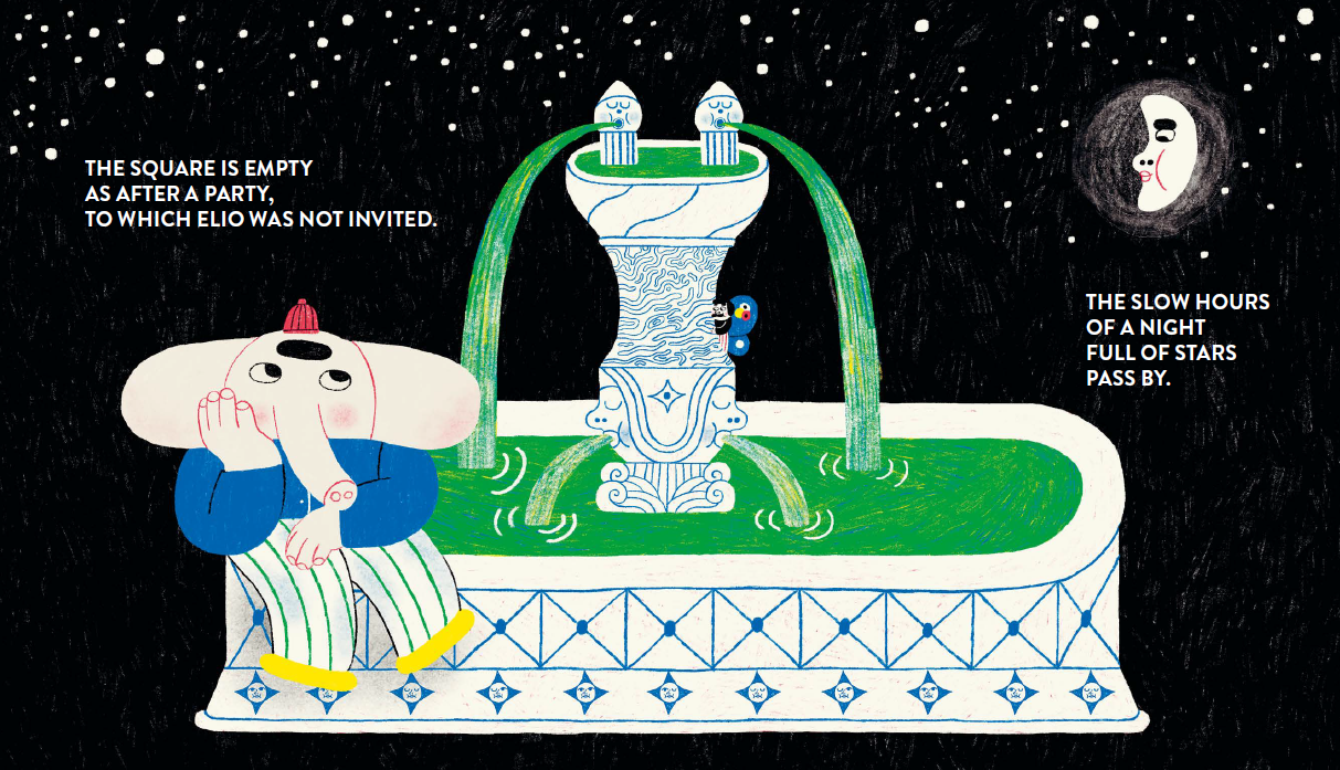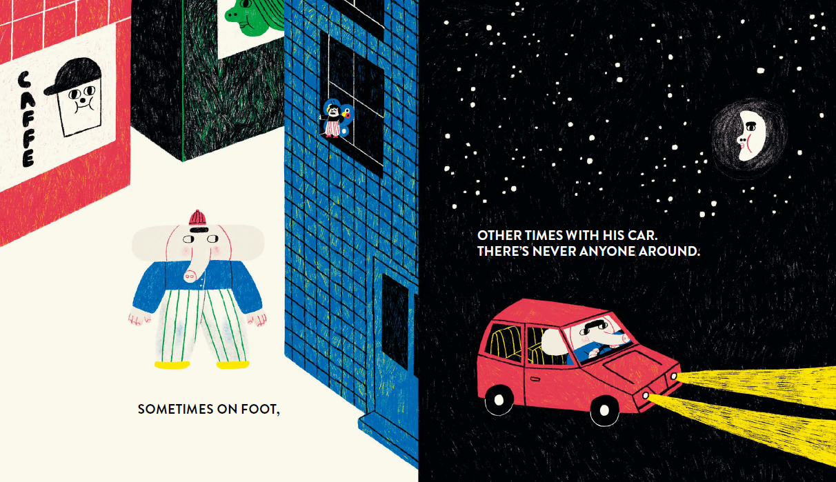 코끼리 엘리오는 피곤하지만 도무지 잠이 오지 않아요. 따뜻한 차도 소용이 없자, 엘리오는 결국 옷을 챙겨 입고 자정에 집을 나섭니다.