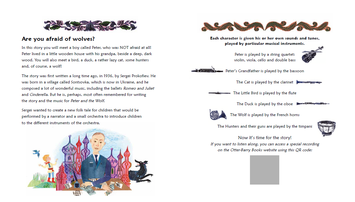 메이휴는 프로코피예프가 음악으로 표현했던 각 캐릭터의 개성을 화려하고 극적인 콜라주 기법으로 시각화했습니다. 늑대에게 통째로 먹힌 오리가 무사히 구출되는 행복한 결말까지, 긴박감 넘치는 서사와 아름다운 삽화가 어우러져 독자들을 음악적 상상력의 세계로 안내합니다. 특히 도입부의 "늑대가 무섭니?" 페이지에 수록된 독점 QR 코드를 통해 이야기와 음악이 결합된 특별한 녹음본을 바로 감상할 수 있습니다.