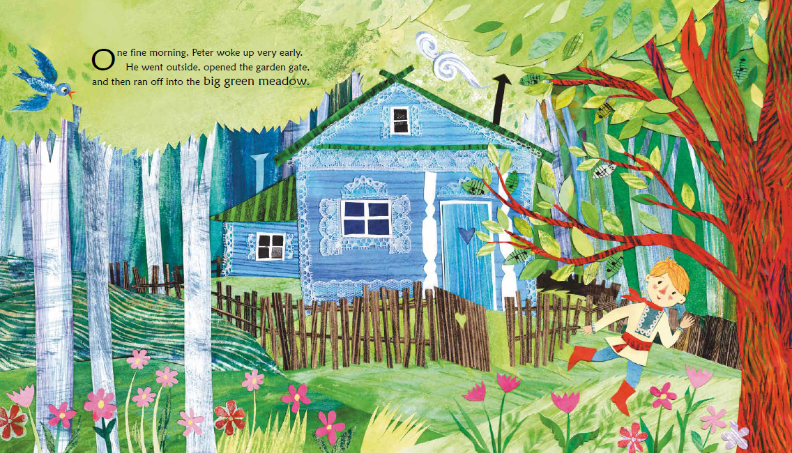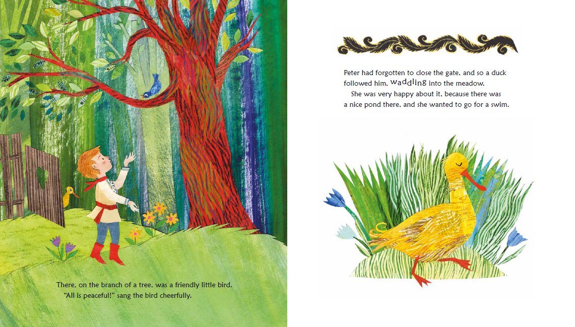 할아버지의 경고에도 불구하고 정원 문을 열어둔 채 초원으로 나간 소년 피터. 그곳에서 오리, 작은 새, 고양이를 만나 즐거운 시간을 보내지만, 곧 굶주린 거대한 늑대가 나타나며 긴장감이 고조됩니다.