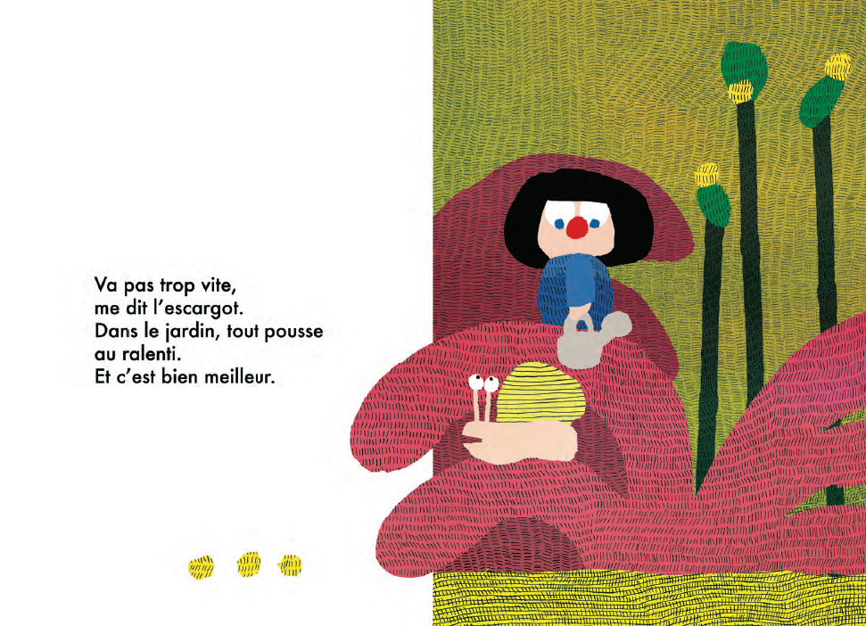 이 이야기 속 사랑스러운 소년은 무엇이든 서두르는 데 선수입니다! 해가 뜨기도 전에 일어나 옷을 꿰어 입고, 아침밥을 순식간에 해치우고, 정원에 물을 듬뿍 준 뒤 딸기 한 움큼을 쥐고 집을 나섭니다. 소년이 만나는 모든 것들—햇살, 잠옷, 신발, 심지어 작은 달팽이와 구름까지도—소년에게 "너무 서두르지 마"라고 속삭입니다.