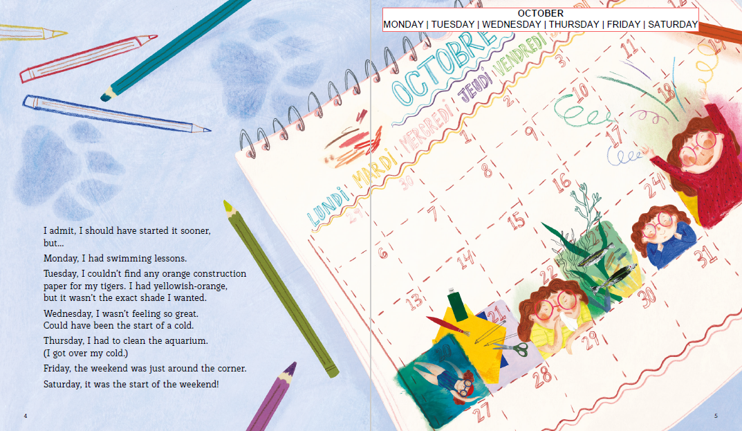 벌써 일요일입니다. 필로는 학교 숙제인 '호랑이 포스터'를 반드시 완성해야만 합니다. 사실 월요일엔 수영 수업이 있었고, 화요일엔 딱 맞는 주황색 종이가 없었으며, 수요일엔 감기 기운이 있었다는 ‘아주 타당한’ 이유들로 미뤄온 과제입니다.