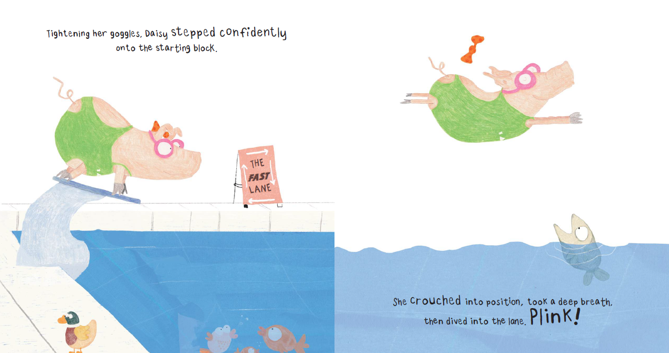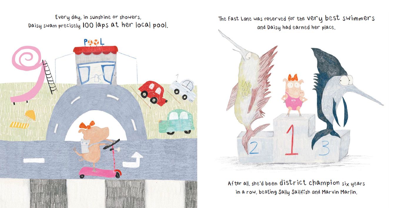 돼지 데이지는 매일 정확히 100바퀴를 도는 지역 수영 챔피언입니다. 그녀는 오직 최고들만 허용되는 '상급자 레인'에서 완벽하게 수영하는 것을 자부심으로 여기죠. 어느 날, 느릿느릿 헤엄치는 개구리 프랭크가 이 레인에 뛰어들며 데이지의 페이스를 방해합니다. 화가 난 데이지는 수영장을 떠나지만, 공원에서 마주친 프랭크는 그녀가 가장 좋아하는 케이크를 건네며 다정하게 사과합니다. 사실 프랭크는 데이지처럼 멋지게 수영하고 싶어 하던 팬이었습니다. 이제 데이지는 100바퀴 수영 후 프랭크에게 수영을 가르쳐주며 함께 물놀이를 즐깁니다. 여전히 가장 빠른 수영 선수이지만, 친구와 함께하는 행복이 1등만큼 소중하다는 것을 깨닫게 됩니다.