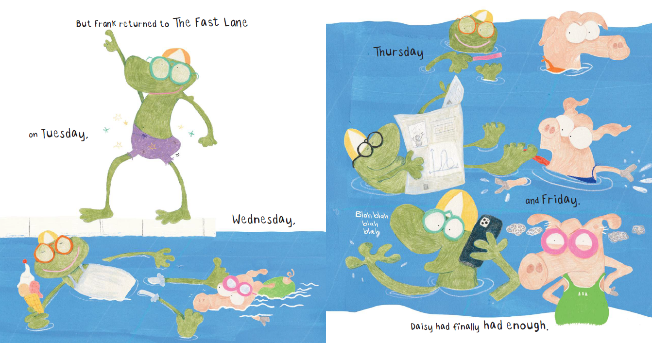 느긋한 개구리 프랭크를 만나 '경쟁'보다 '소중한 우정과 여유'를 발견하는 이야기"