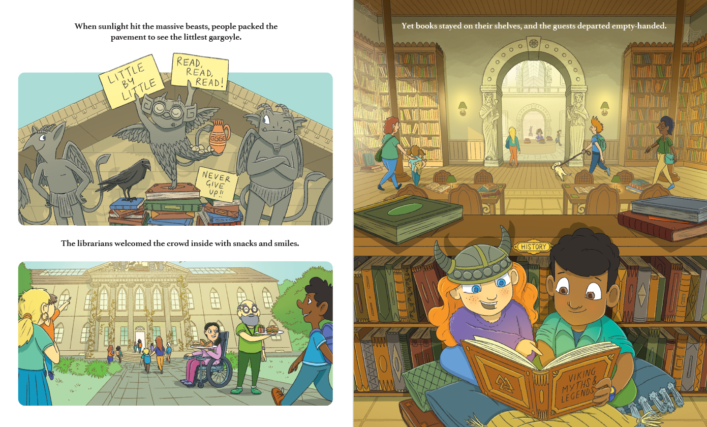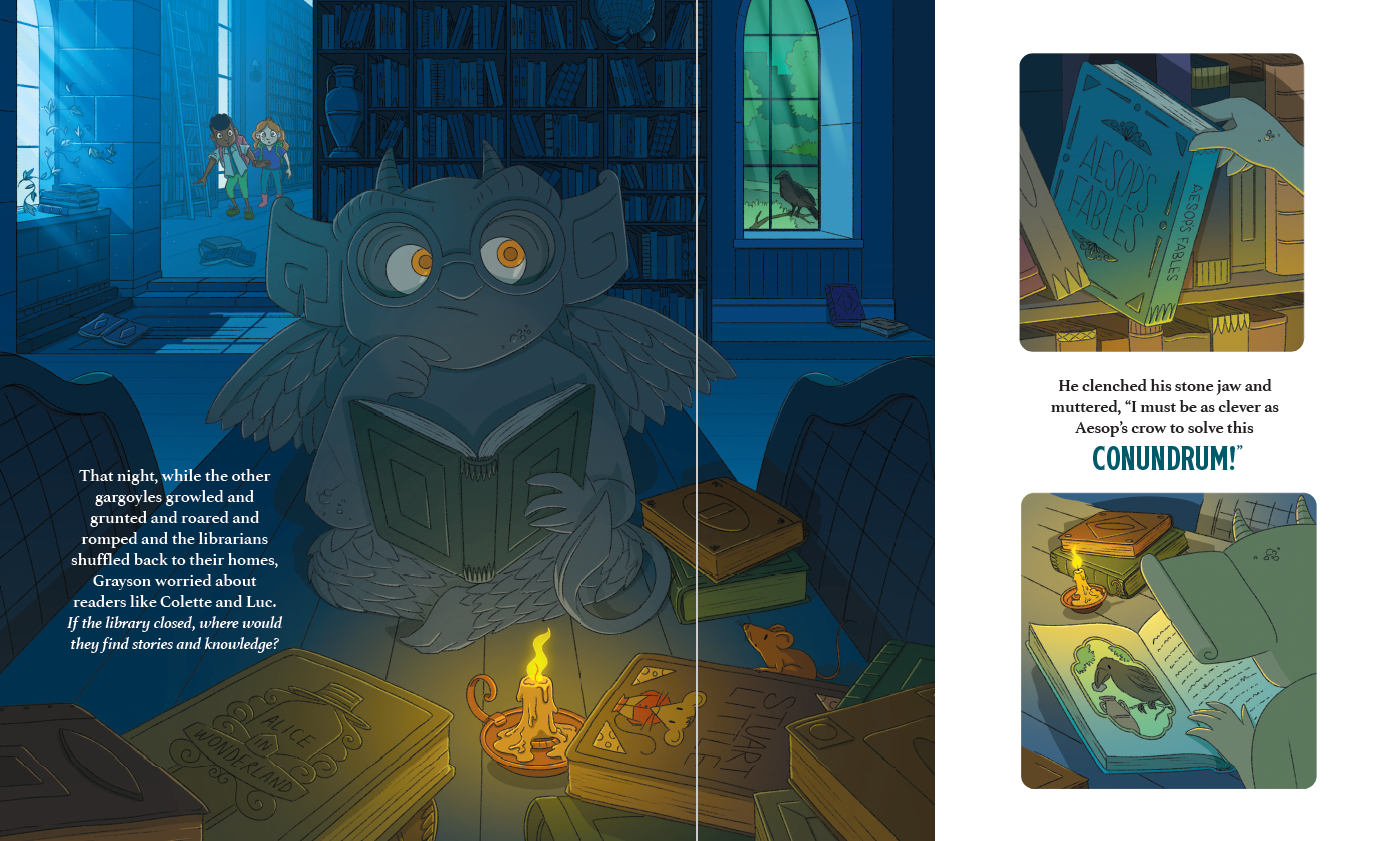 조용한 도서관 높은 곳에는 도서관을 묵묵히 지키는 가고일 그레이슨이 살고 있습니다. 어느 날, 그레이슨은 도서관을 찾는 사람들의 발길이 점점 줄어들고 있다는 사실을 깨닫게 됩니다. 자신이 그토록 사랑하는 공간이 사라질지도 모른다는 위기감을 느낀 이 수호 석상은 직접 행동에 나서기로 결심합니다. 그레이슨은 마을 사람들을 다시 도서관으로 불러모으기 위해 엉뚱하면서도 영리한 계획을 세웁니다.