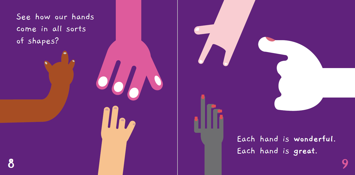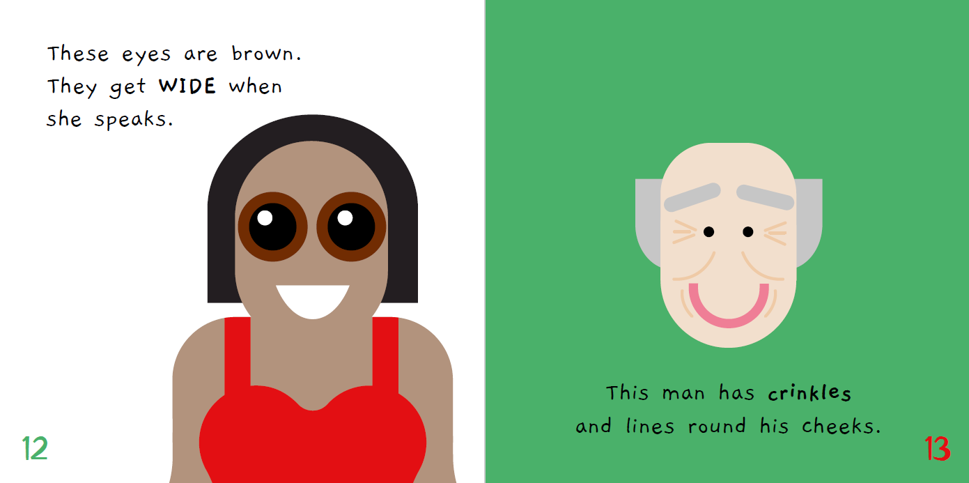 사람은 저마다 다른 모양과 크기를 가지고 태어납니다. 이 시리즈는 우리 몸이 서로 다를 수 있는 모든 방식이 얼마나 경이로운지를 영유아의 눈높이에서 들려줍니다. "그녀의 얼굴은 친절하고 따뜻해요, 그리고 아주 넓지요.", "길쭉하고 쭉쭉 뻗은 다리는 마치 키 큰 줄기 같아요.", "이 손톱 좀 보세요, 분홍색 물고기 비늘 같지 않나요?"와 같이 감각적이고 비유적인 표현을 통해 신체의 특징을 긍정적으로 묘사합니다.