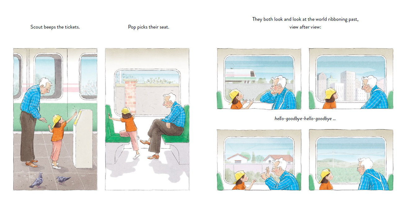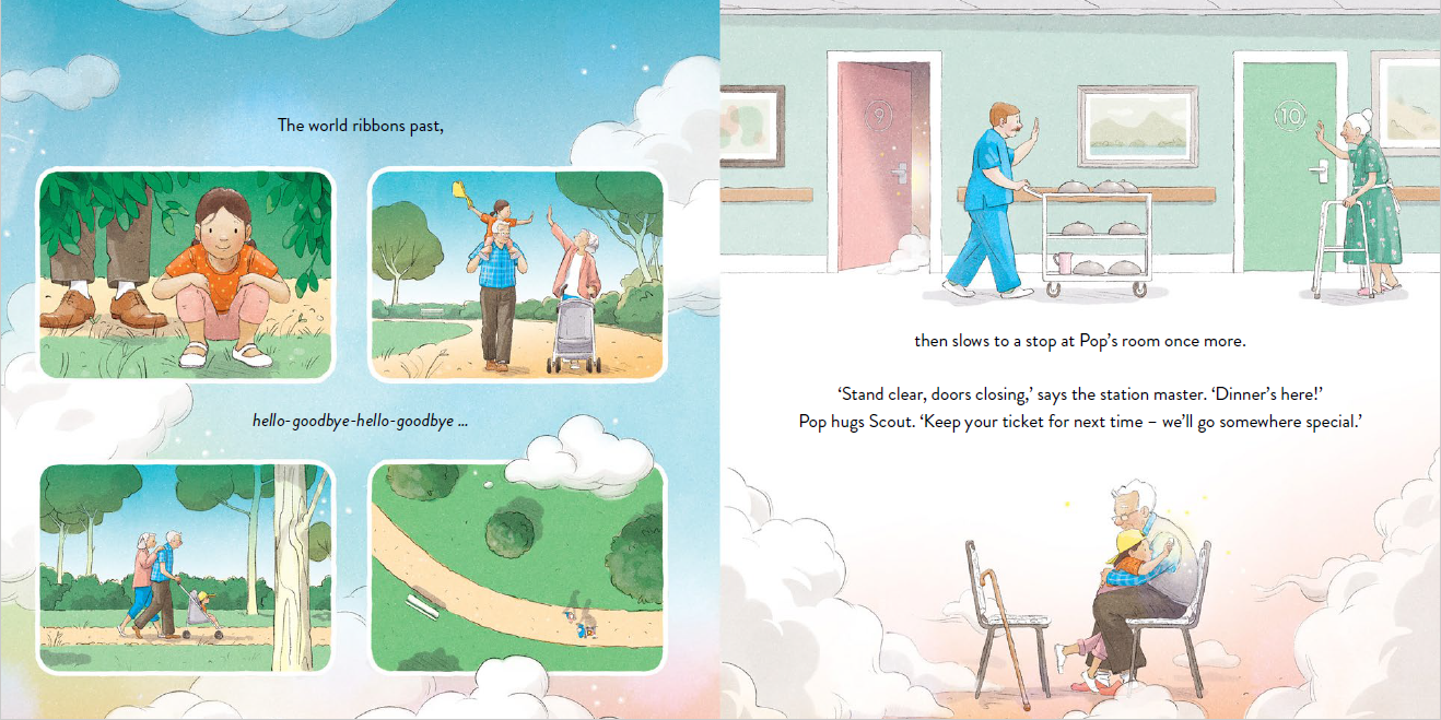 하지만 어느 날 할아버지의 건강이 나빠져 요양 시설로 옮기게 되고, 창밖 풍경이 하나뿐인 방에서 지내게 됩니다. 스카우트는 슬퍼하는 대신 할아버지의 침대 옆에 '기차역'을 만들고 종이 티켓을 준비합니다.