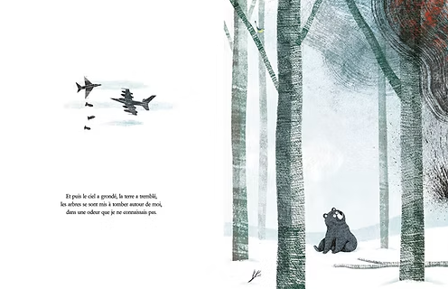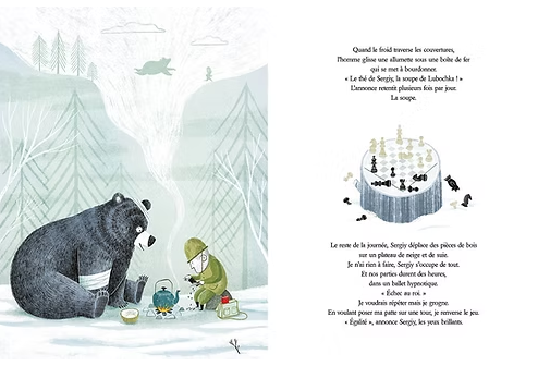 세르게이가 잠든 사이, 루보치카는 그의 면도기로 털을 다듬고 군복을 챙겨 입습니다. 자신에게 이름을 준 은인이 다시는 참혹한 곳으로 돌아가지 않기를 바라는 마음으로, 곰은 병사를 대신해 어둠 속에서 군용 트럭에 몸을 싣습니다. "곰의 이름으로 약속할게. 네 대신 내가 가지만, 꼭 돌아올게." 라는 마지막 고백은 독자들에게 전쟁의 비극을 넘어선 강력한 연대와 희망의 메시지를 전달합니다. '국제 앰네스티 프랑스 지부'와 협력하여 출판된 이 작품은 인간과 자연에 미치는 분쟁의 상처를 섬세하고 유머러스하게 그려내며, 우크라이나와 러시아 분쟁을 연상시키는 장치들이 포함되어 있으나, 이를 특정 국가의 사건에 국한하지 않고 보편적인 평화의 가치를 일깨워줍니다.