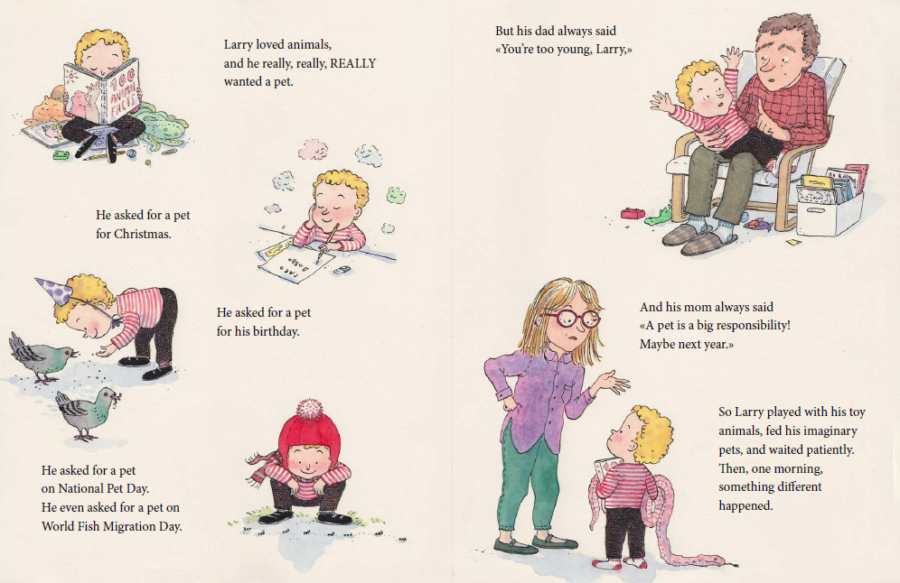 래리는 아주 오래전부터 반려동물을 키우는 것을 꿈꿔왔습니다. 크리스마스, 생일, 심지어 '세계 물고기 이동의 날'에도 반려동물을 사달라고 졸랐지만, 부모님은 래리가 너무 어리다며 조금 더 기다리라고 하셨죠. 그러던 어느 날, '세계 개구리의 날'에 아빠가 드디어 허락을 하셨습니다! 래리는 기뻤지만 곧 고민에 빠졌습니다. 세상엔 멋진 동물이 너무 많아서 어떤 동물을 선택해야 할지 알 수 없었거든요.래리는 주위 사람들에게 조언을 구하기 시작합니다.