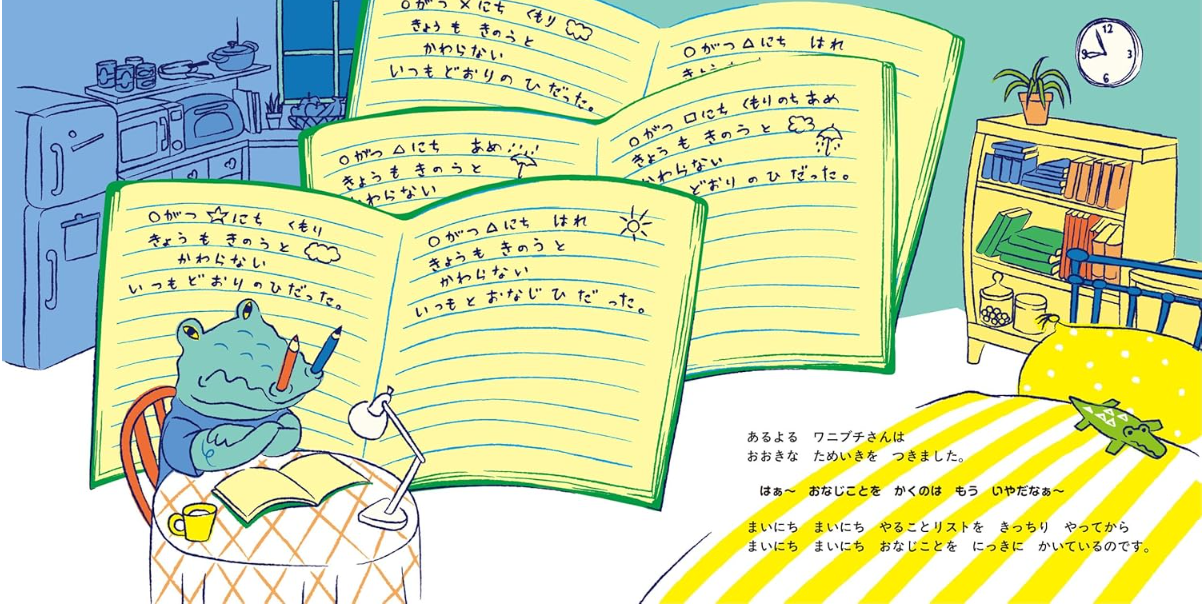 그는 매일 아침 ‘할 일 목록’을 만들고, 한 치의 오차도 없이 일과를 해내는 세상에서 가장 진지한 악어입니다. 하지만 매일 밤 일기장에 쓰는 내용은 어제와 똑같았죠.