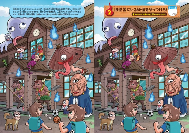 무대는 요괴들에게 침략당한 학교,교실, 복도, 급식실, 체육관, 운동장 등 총 33개의 스테이지에서, 쌍둥이 남매 ‘린’과 ‘렌’과 함께 페이지 구석구석까지 빼곡하게 그려진 요괴들 속에서 틀린 부분을 찾아낸다.