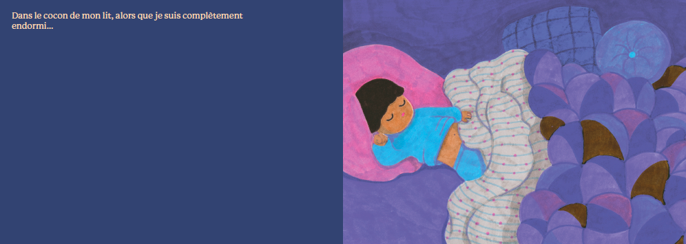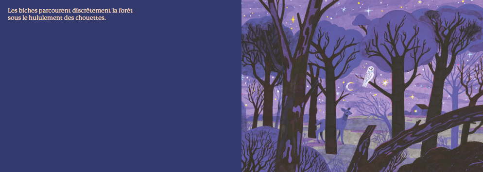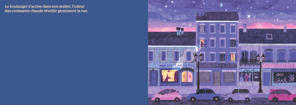 작가 루시 브뤼넬리에르는 사인펜을 활용한 독특한 그래픽 기법으로 밤의 다채로운 정서를 표현합니다. 짙은 파란색과 보라색의 조화로운 변주는 깊어가는 밤부터 동이 터오는 새벽까지의 시간적 변화를 시각적으로 구현하며, 독자들에게 명상적이고 평온한 휴식을 선사합니다. 아이들이 꿈을 꾸는 동안 부지런히 하루를 준비하는 제과점의 활기찬 새벽 풍경까지 담아내어 밤에 대한 두려움을 호기심과 따스함으로 바꿔주는 아름다운 그림책입니다.