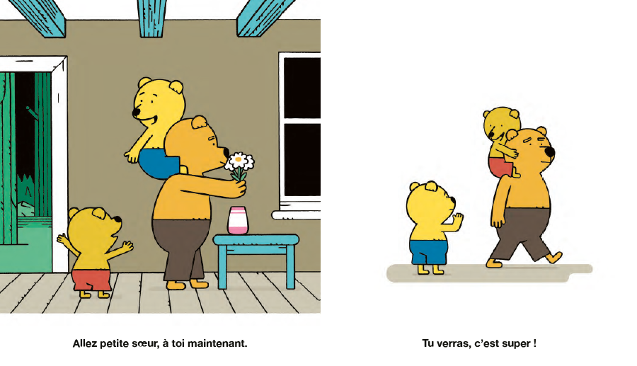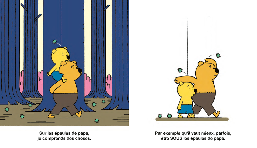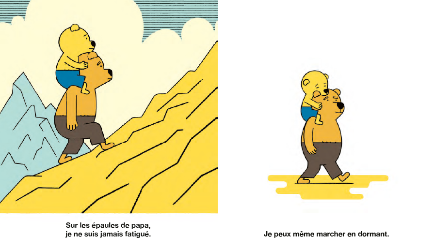 아빠의 어깨 위에 올라타면 아이는 단숨에 거인이 됩니다. 나무에 열린 과일을 직접 따기도 하고, 평소에는 보이지 않던 나비의 섬세한 움직임도 관찰할 수 있죠. 무엇보다 아빠 어깨 위라면 아무리 멀리 가도 지치지 않고, 심지어 잠든 채로도 걸어갈 수 있습니다. 아빠와 아이 사이의 단단한 유대감과 믿음을 아이의 시선에서 유머러스하고도 다정하게 담아냈습니다.