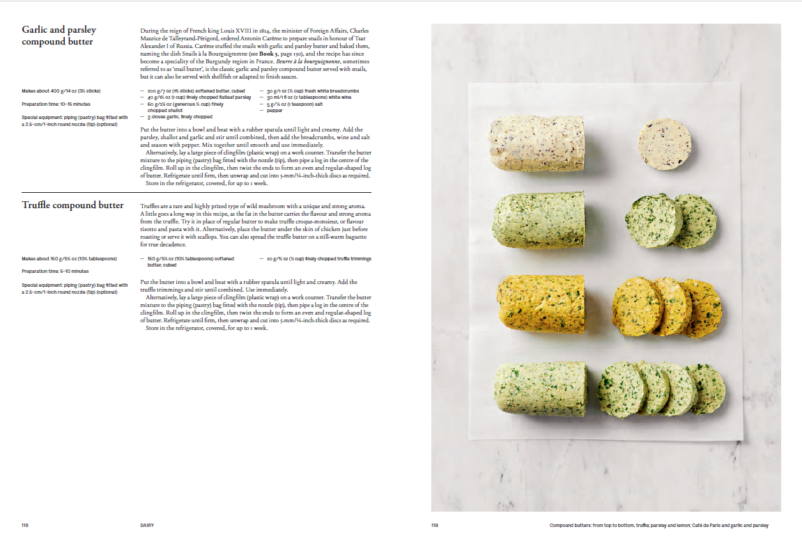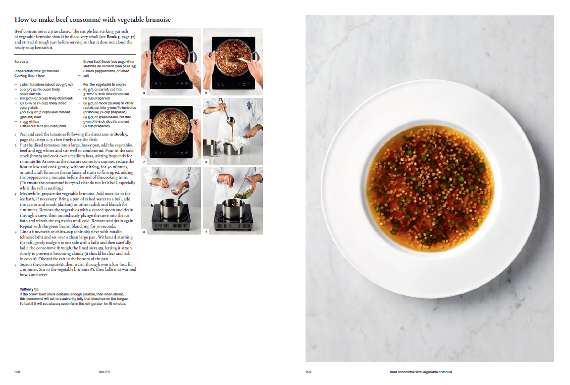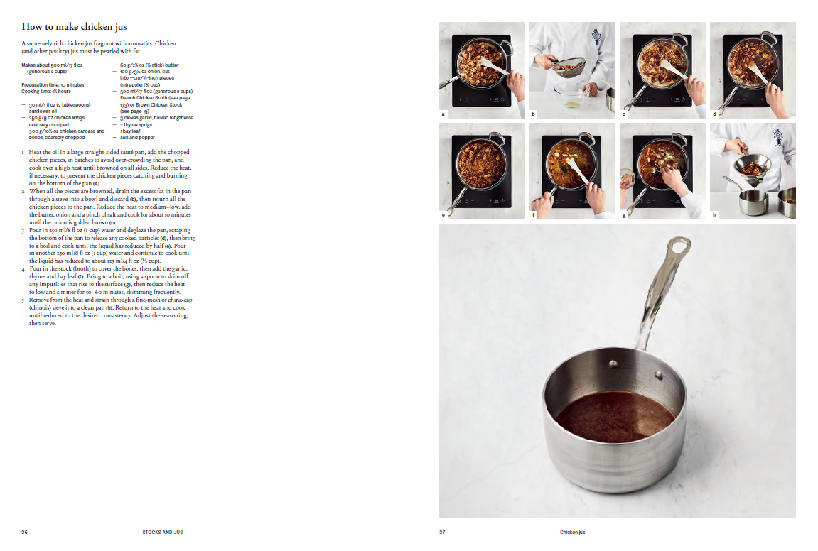 아티초크 손질, 생선 가시 제거, 가금류 트러싱(모양 잡기)과 같은 단독 테크닉뿐만 아니라 마요네즈나 화이트 치킨 스톡 제조법 등 기본 기법을 활용한 수백 가지의 클래식 및 컨템포러리 레시피가 수록되어 있다.